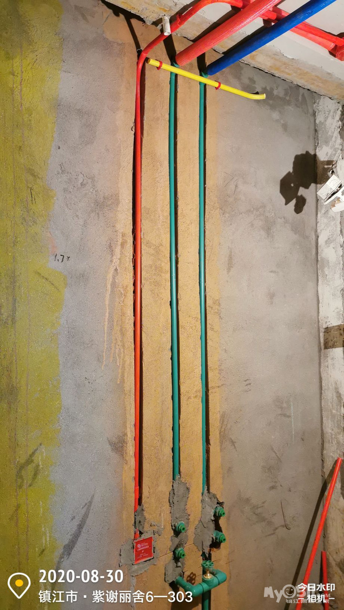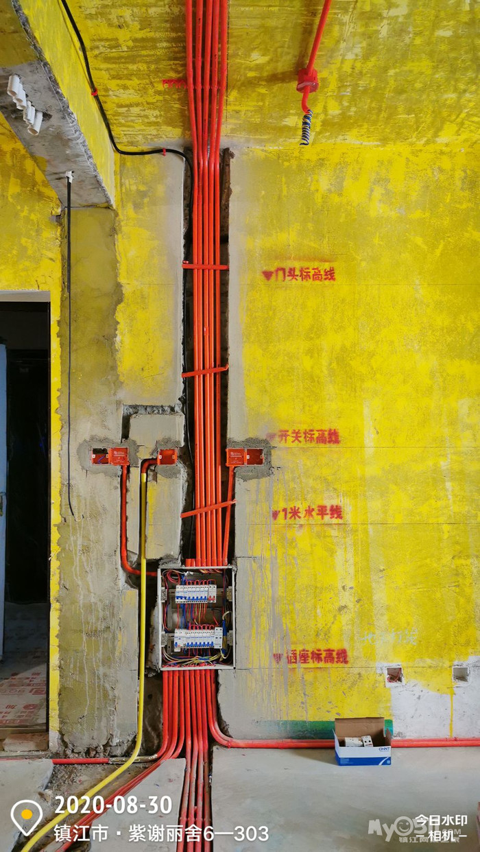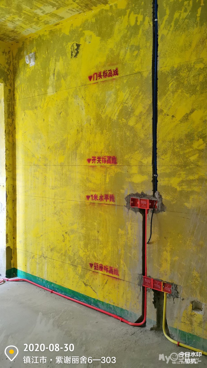目前阶段:水电重排要求更新内容:强弱电要求(所有强电线路必须重排,除照明、厨、卫外一律不得用原墙体线管,原房屋电线不可使用,弱电线必须重排)强电规范(空调单独回路;柜机4㎡火零线、2.5㎡地线;挂机2.5㎡;卫生间单独回路,4㎡火零线,2.5㎡地线;厨房插座线单独回路,4㎡三根;客餐厅插座线单独回路,2.5㎡三根;其他区域插座依现场实际情况分开1~3个 区域、照明回路弱电插座全部单独回路,禁止串联;)所有线头必须用胶布保护除墙体内水管全部加保温棉处理,冷水管用蓝色保温棉,热水管用红色保温棉。水管保温必须穿好再热熔,水管用32的吊卡统一固定,固定距离为80cm,弯头处吊卡不超过15cm