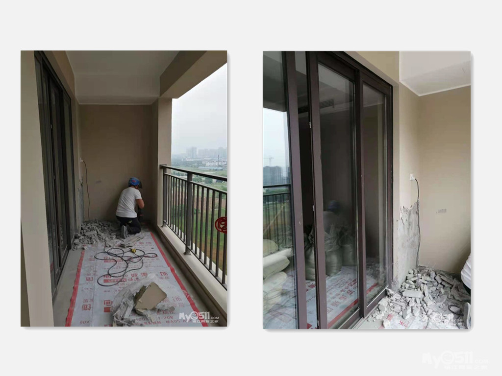 现场在进行阳台窗框的安装拆除已到位,由于垃圾场垃圾太满,没有及时清运电工在进行定位调整