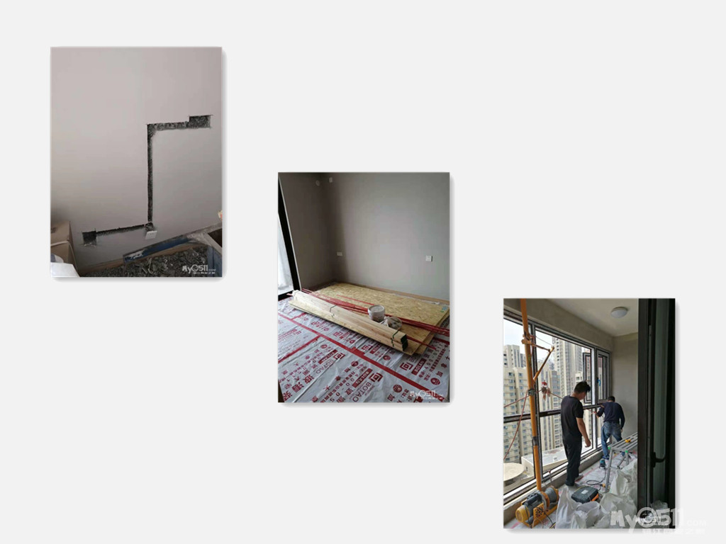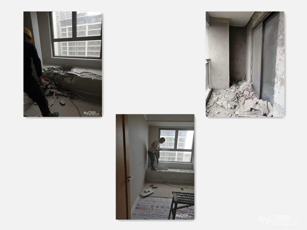 现场今天进行拆除工作,拆除的项目是阳台的保温层和北边两个飘窗拆除!后续将进行电位的调整
