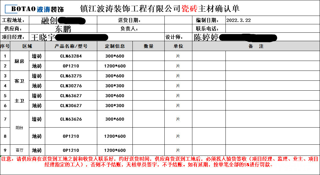 今日工地施工:瓷砖、过门石确认下单。