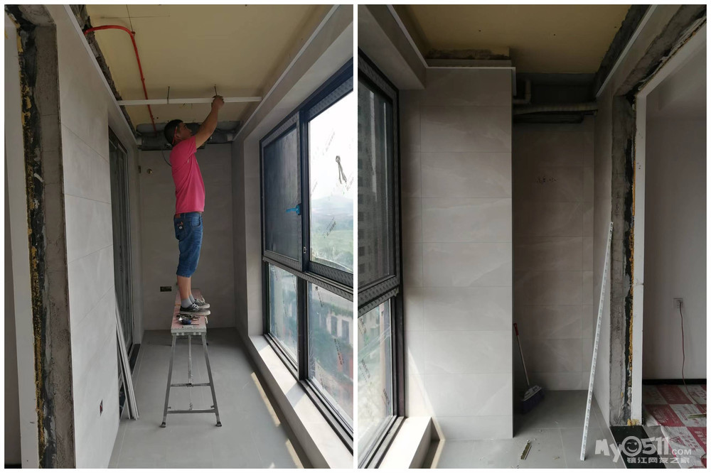 今日工地施工:阳台美缝施工完成。开始装集成吊顶了