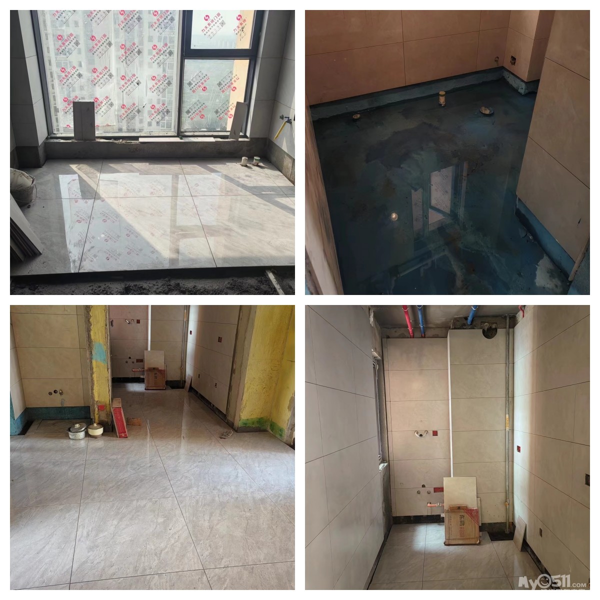 今日工地施工:客餐厅贴砖+卫生间闭水试验