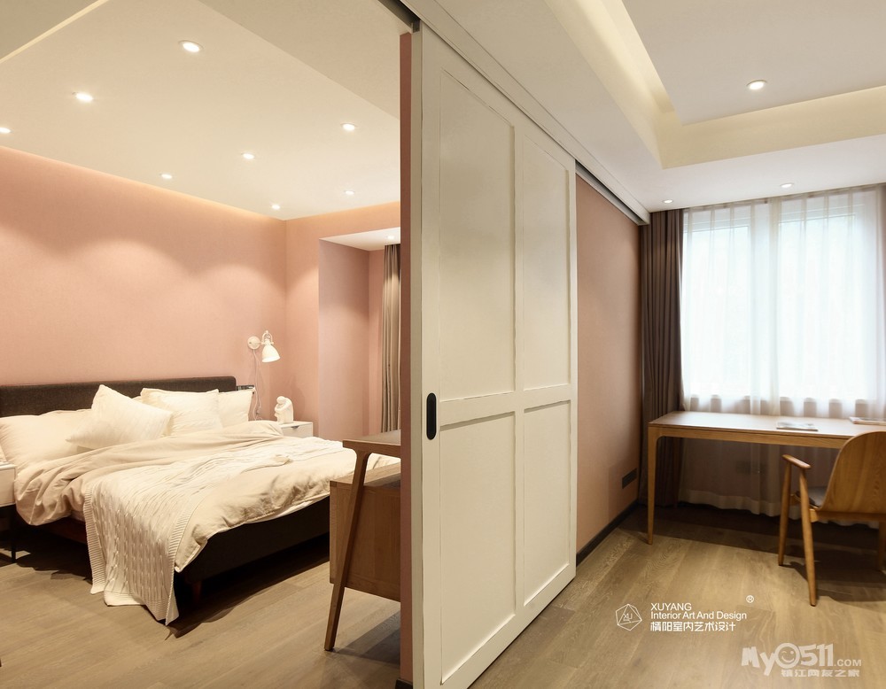 女儿房洋溢着浓浓的柔美气息,轻盈又少女的淡山茱萸粉墙面令人怦然心动,既带来了粉色的甜美温柔,也不会让人感到过分甜腻,床品、沙发和柜子的选择也尽量贴合矜平躁释的情绪,整个空间充斥着满满的浪漫和腔调。