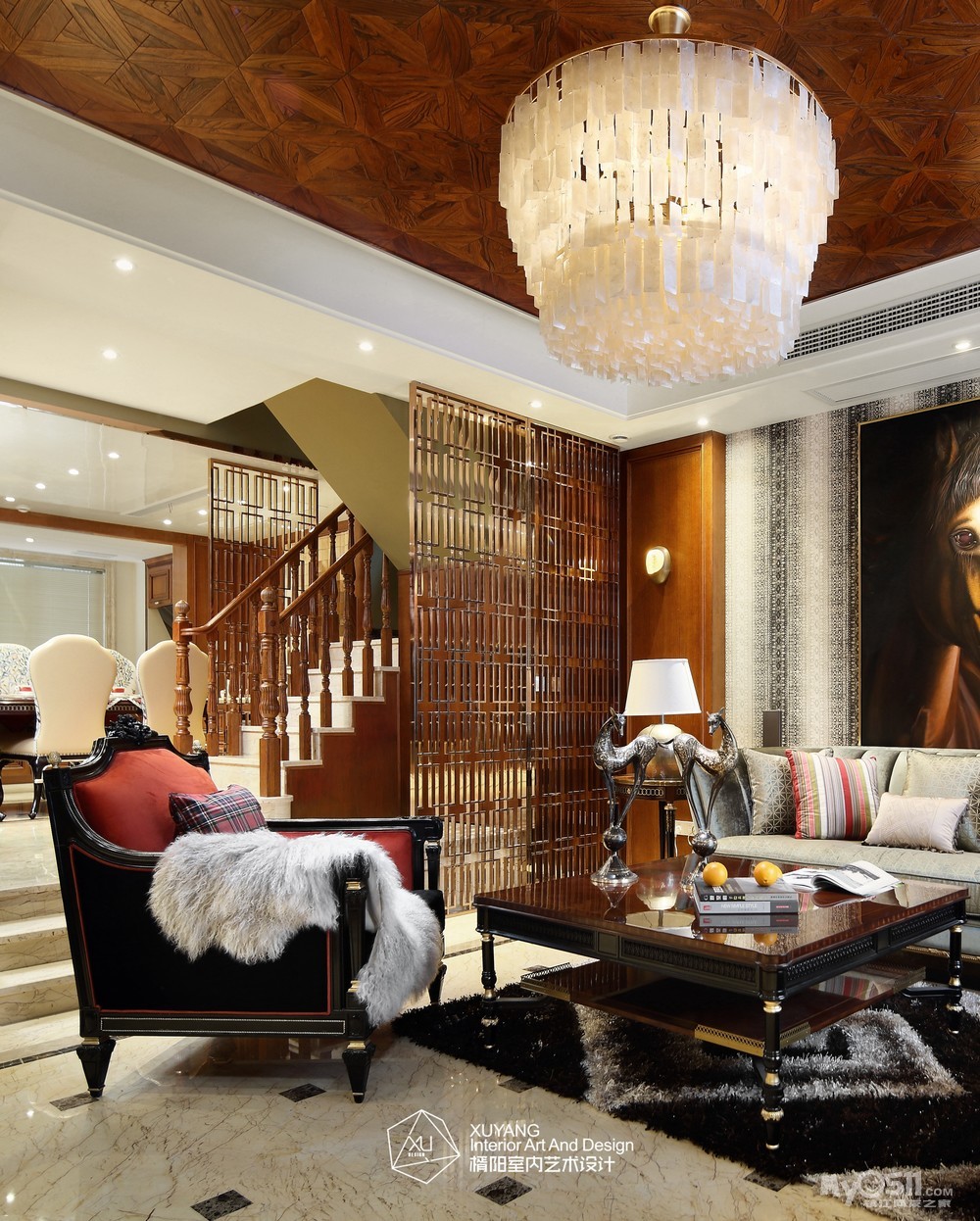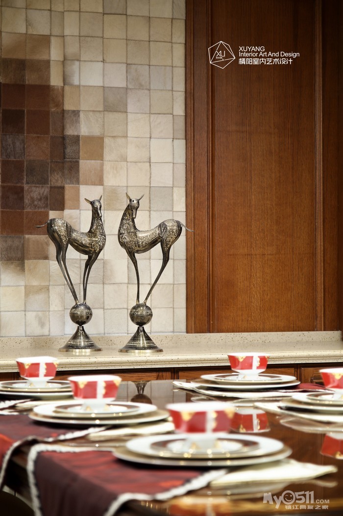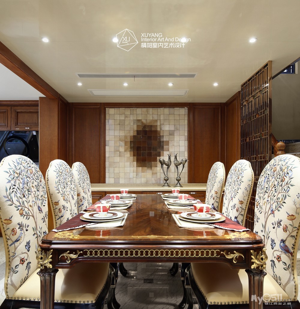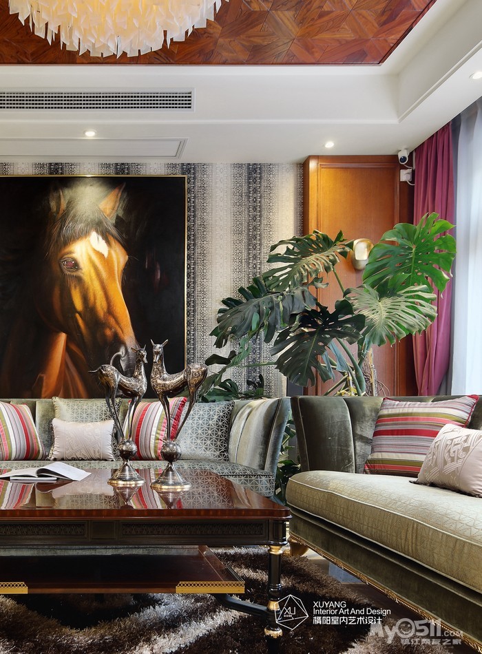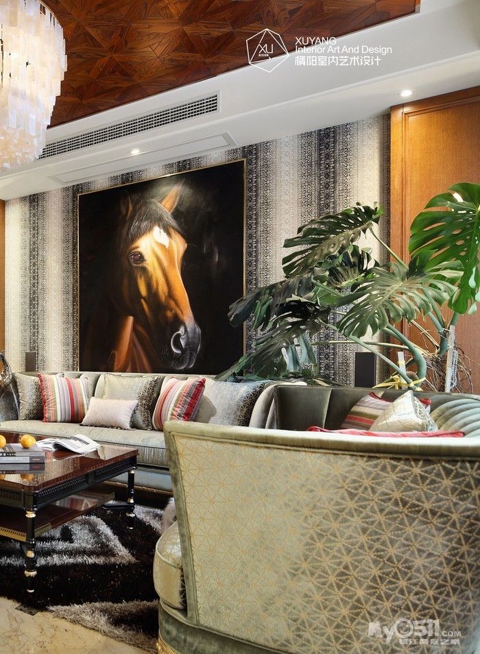 因为空间的主角永远是人,设计具有太多形式与风格,却不一定适合每个个体,而如果从生活层面来做设计的考虑,就不致会有太多的偏差。本案可以说是一个“去风格化”的设计思路,从开阔明朗的布局优势,到序列感的餐桌腿造型和金属感马赛克线条,从独特的骏马挂画到室内餐桌上的轻雕细刻,叠合出一处处“精妙又讲究”的片段,每一个细枝末节似乎都在展示奢华与不媚俗的平衡意义。