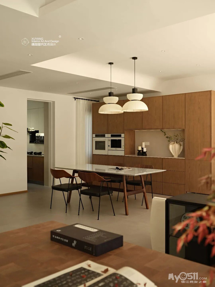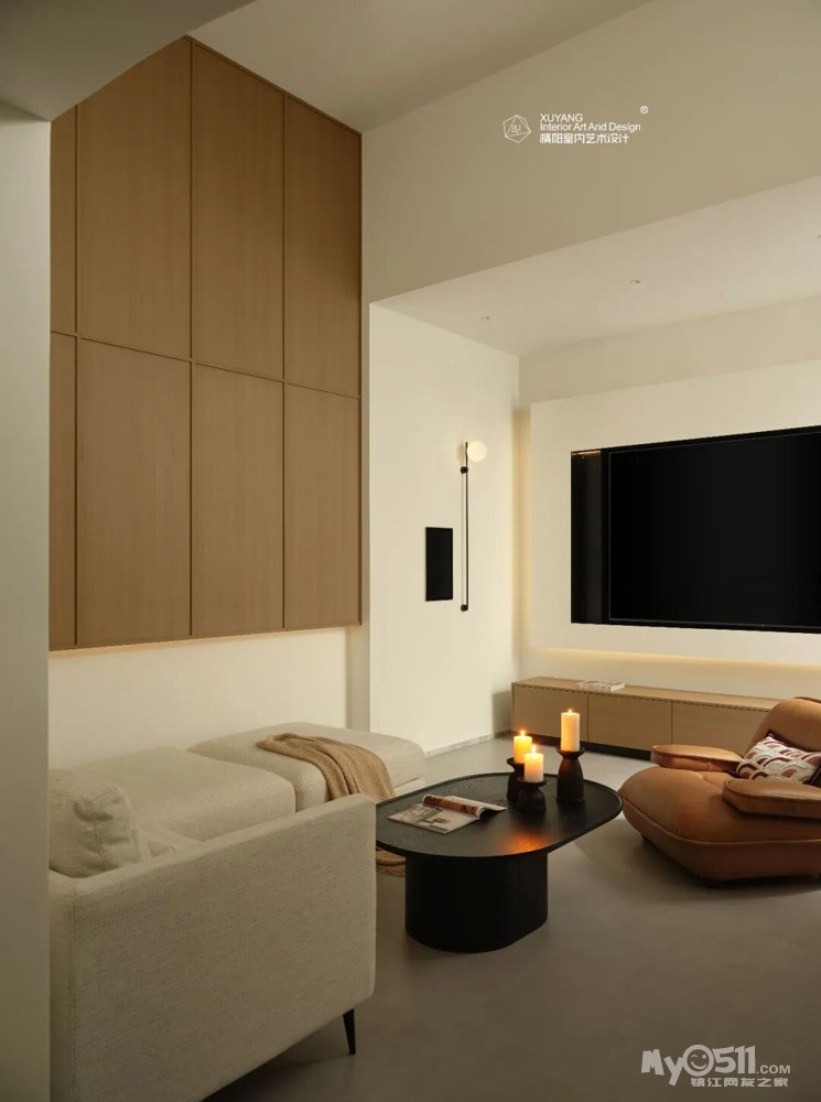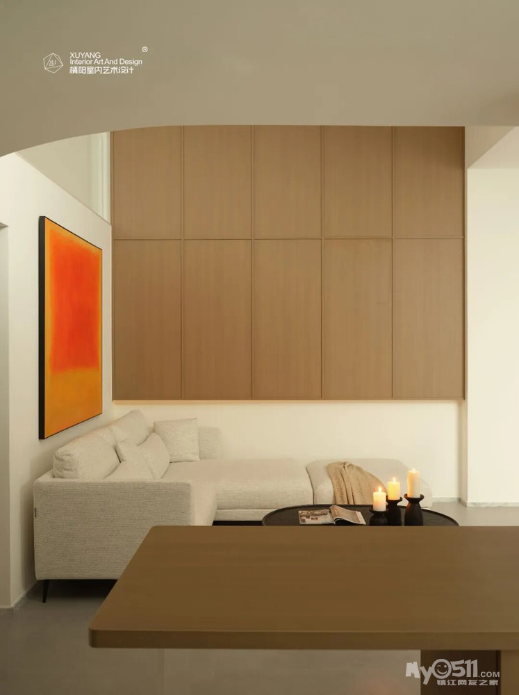 定制木作贯穿公共区域,统一了收纳与界面,也稳定了空间的整体气质。