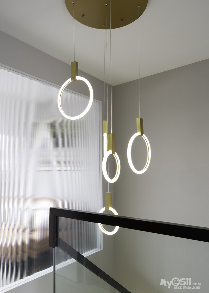 楼梯选用玻璃的材质,既安全又可以穿透自然的光线到每一层。充满趣味的楼梯间吊灯,搭配暖色调金属底座,照亮着每个来临的夜晚,整个空间里静谧又充满活跃的气息。