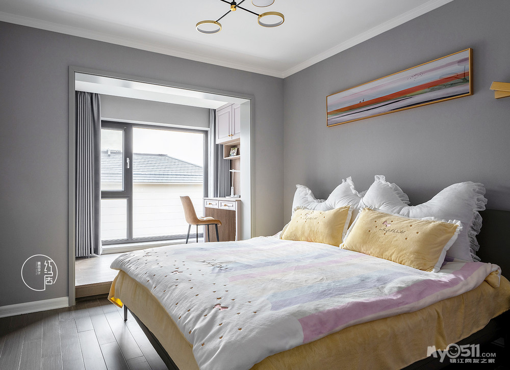 女孩房原始的阳台空间归纳到了室内,很有特色的形成了地台式书房,属于小主人自己的小天地。悬空书架上陈列着书籍与精心挑选的玩偶,云朵状的床靠背充满着童话故事的梦幻感,空间显的活泼,可爱感十足,处处都充满了小主人公对生活积极的热爱与美好生活的向往。