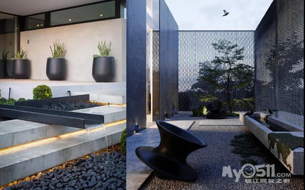 大面积铺设鹅卵石,再加上水系和灯光元素的加入,没有过多华丽的装饰,但却让人一眼就感受到了满满的高级和设计感。