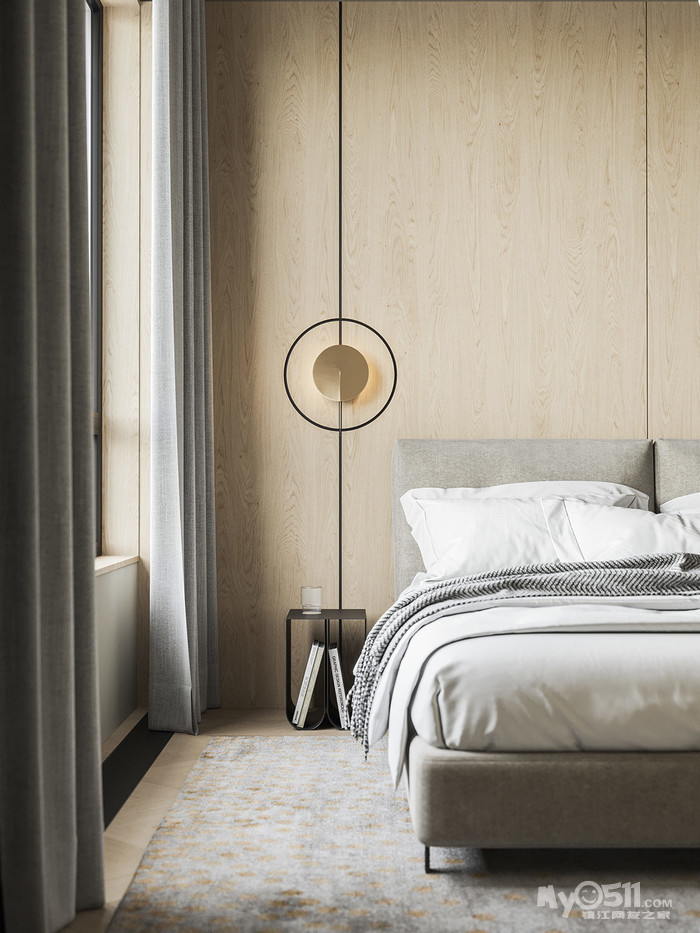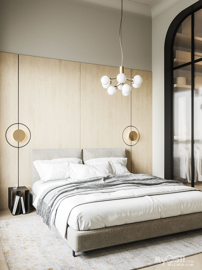 主卧室的墙壁和天花板漆成同一种颜色,用一个简约的圆形檐口将其视觉连接起来;