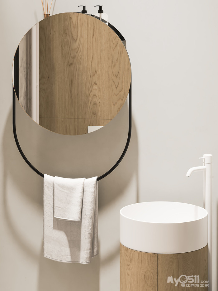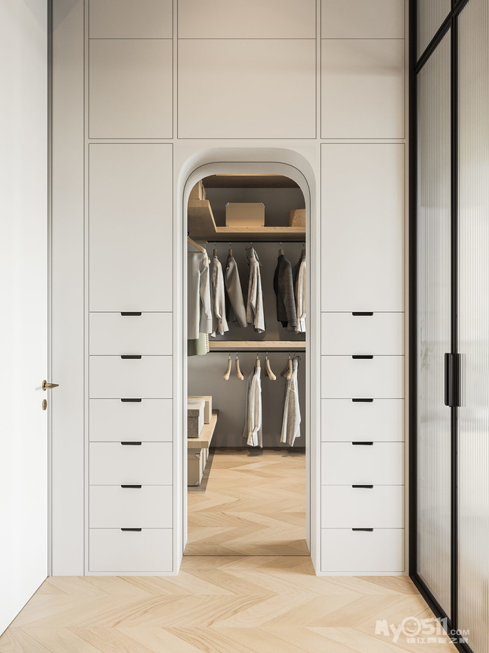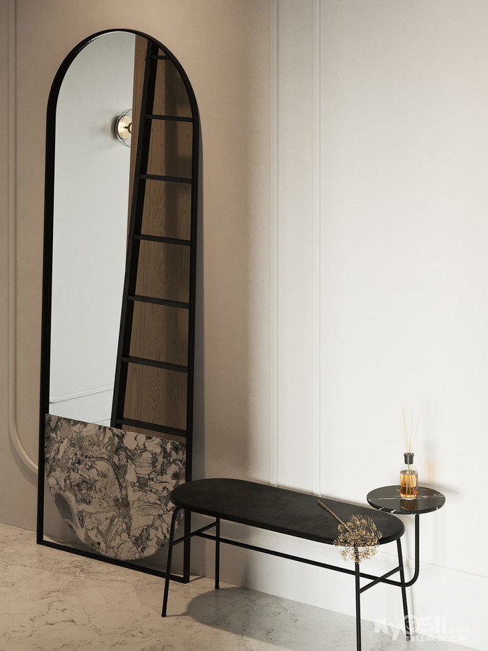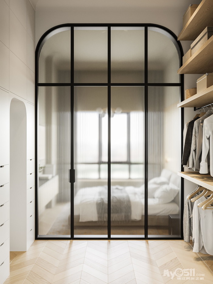 我们不谋而合地决定将玻璃隔墙和更衣室的镜子以拱形实现。