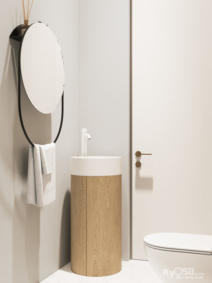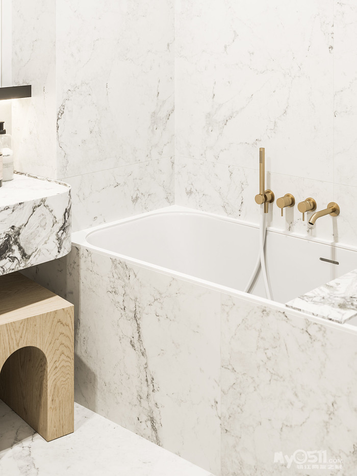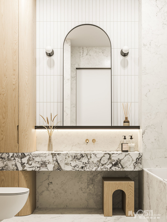 悬挂式洗手台用了比墙面地面对比度更高的大理石来制作。