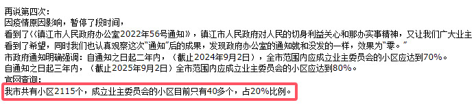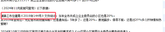 据镇江市住建局《2019年144号》文件统计:当年全市共成立业主委员会的小区也是20%。