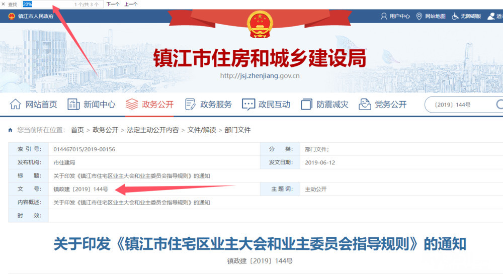 ”在政府官网进行查询,确有市住建局【2019】144号文件,但文件中只有3处“20%”的语句,均非您所述“