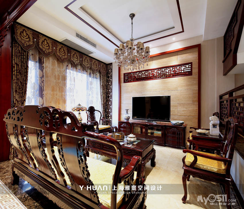 业主说不拘泥于一种风格,他说虽然是中式,他可以接受奢华舒适欧式元素,所以主灯我们选用的是水晶灯,但是水晶的颜色我们定制的干邑色,色彩得融入到整个环境中才行