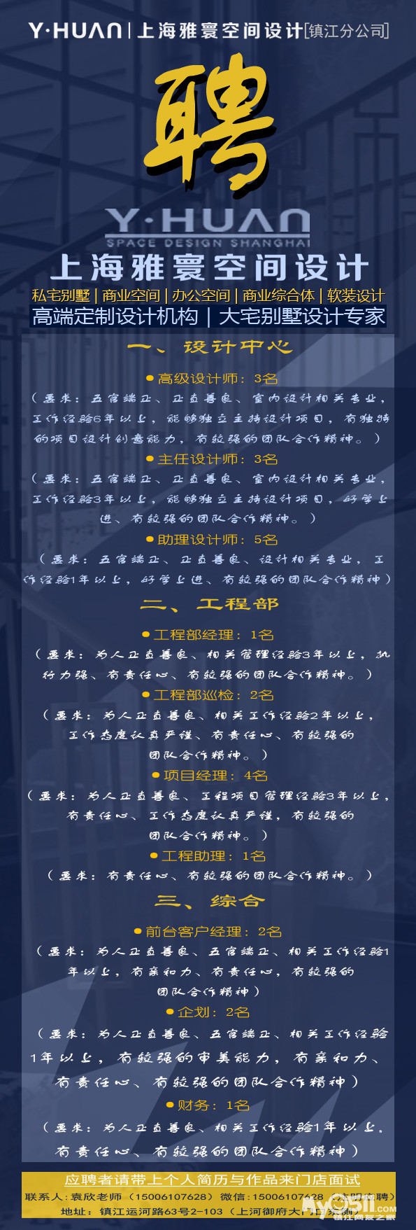 » 上海雅寰设计诚聘:设计师、前台、客户经理、业务员、设计助理、广告企划、工程巡检