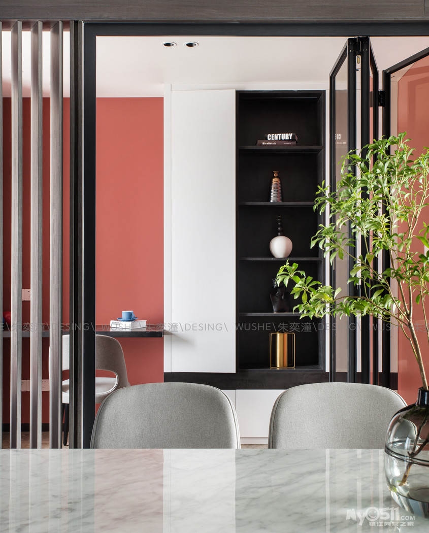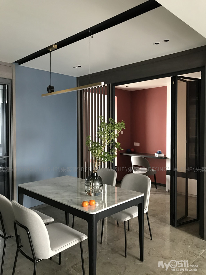● 本次案例最大的改动就是将原本的儿童房的位置进行改造,变成一个敞开式书房,大大弥补了餐厅空间局促的同时也延伸了门厅的视角。