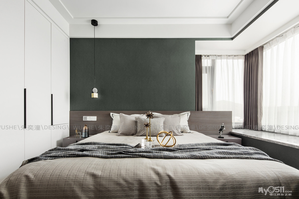 床头采用半护墙的形式,低调而精致。飘窗的转角位置巧利用,将每一寸空间利用的淋漓尽致。