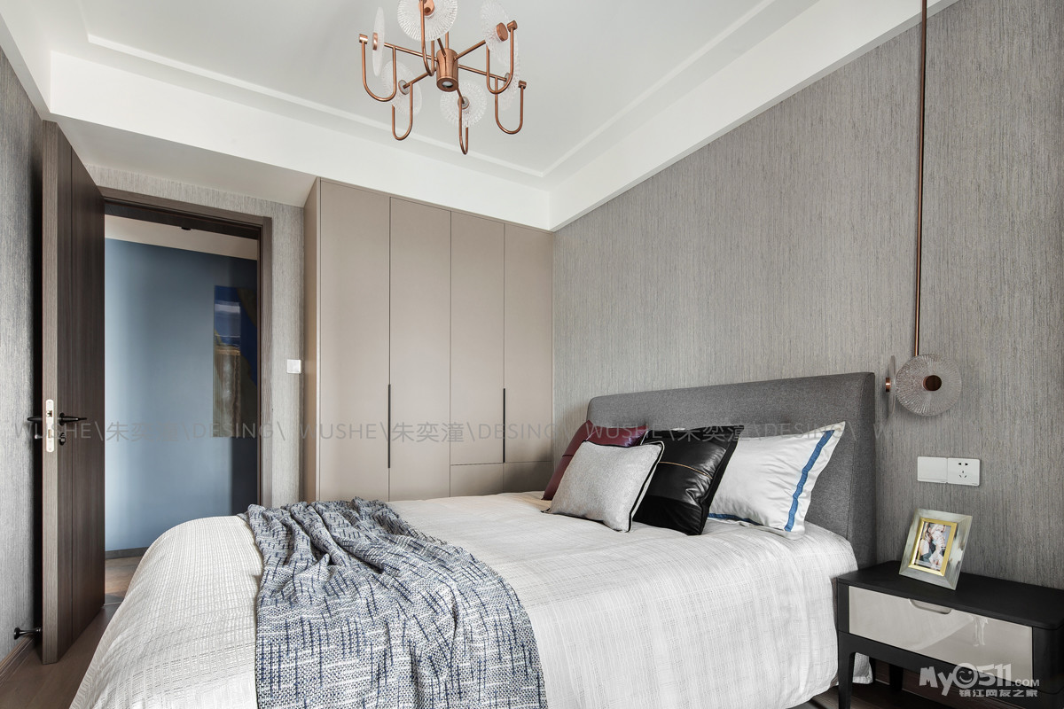 次卧是给父母准备的,咖啡色的床头搭配黑色的床头柜,简约风的复古灯具更是点睛之笔,整个空间雅致而又不失气质。
