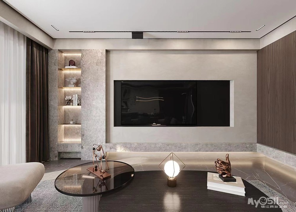 考虑到住宅的采光条件不错,所以主色调最终选择了深咖色。客厅阳台安装落地窗,灰咖在自然光的烘托下,房屋显得既明亮通透、又有高级质感。整个顶部的设计遵循了“大气至简”的中心思想,用灯光布局承担氛围渲染的作用。各种形式的点光源穿插在流光岁月中,作为空间活跃的点缀,电视墙地台离地20cm做内凹收口,没有完全落地,一则避免硬直线条的呆板感,二来为设计格调一致的居室带来一些细微层次感的变化。整个客厅呈现出一致、极简的美,也不乏打破呆板的细节变化。