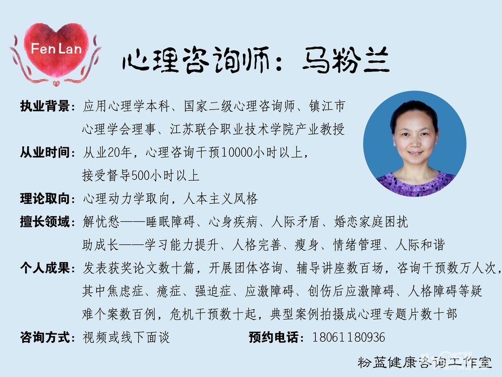 “粉蓝健康咨询工作室”针对每个来访者提供定制化服务,限定数量,按照预约先后承接,根据个案和个体情况可以选择视频或线下面谈,预约电话:18061180936,地点:镇江市润州区黄鹤山路8号朴园上观。