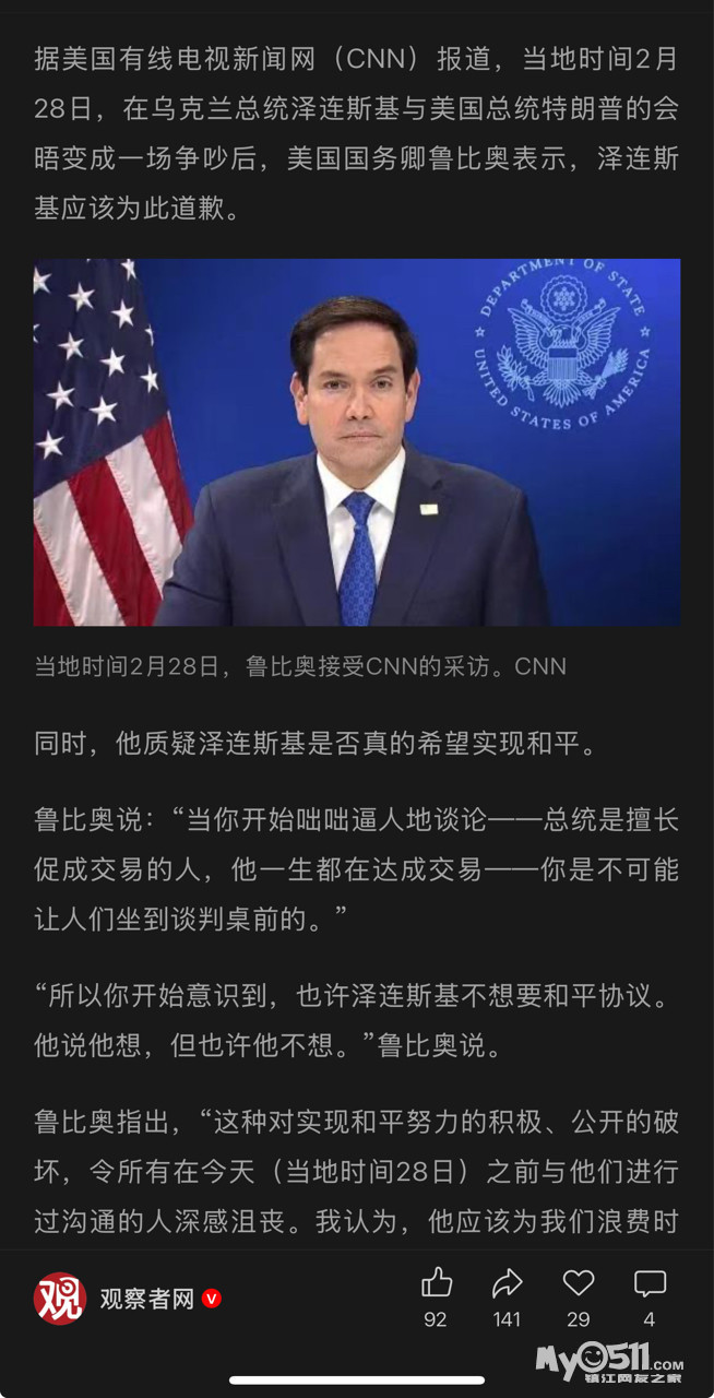 鲁比奥:泽连斯基应该道歉