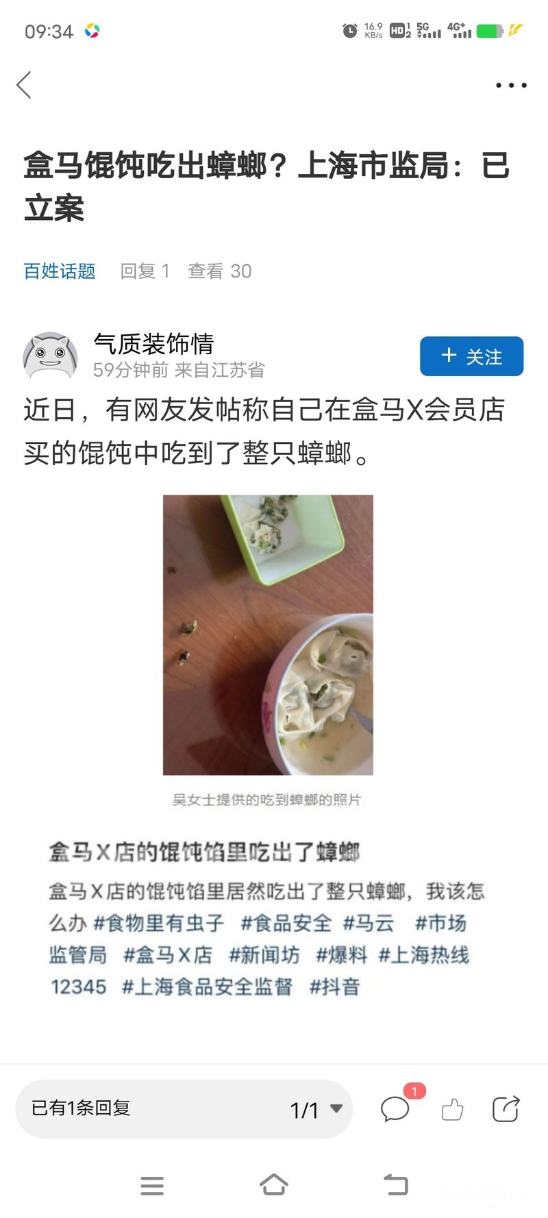 盒马因自产品牌大馄饨嚼出整只蟑螂,被立案调查