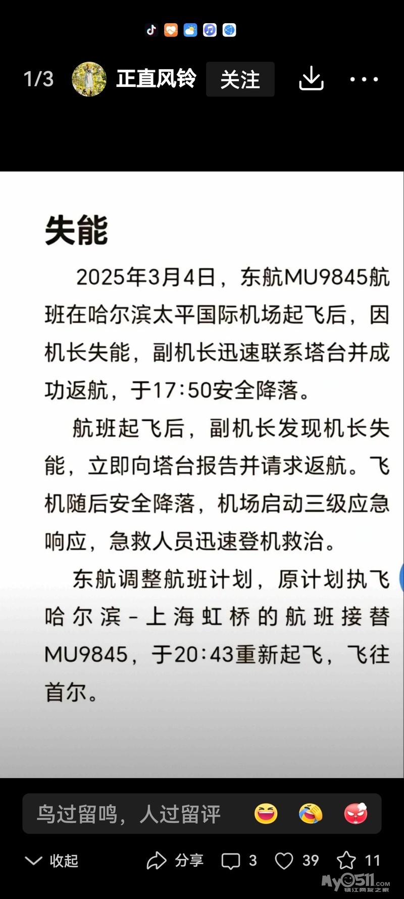 » 咋天东航哈尔滨—首尔飞机机长失能口吐白沫,副机长把全机安全带回