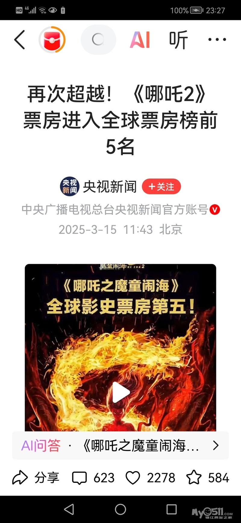 央视新闻:哪吒2魔童闹海入全球票房前5名。。我预测会全球票房第一。