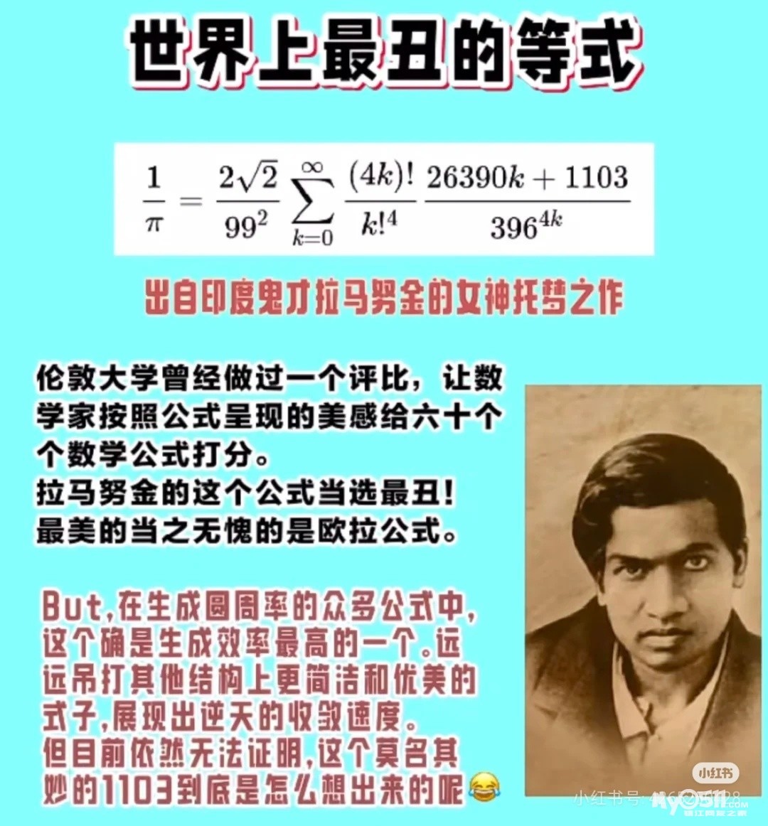 却是目前最高效的圆周率生成公式。至于怎么想出来的,拉马努金自己也说不知道,是梦里女神告诉他的。