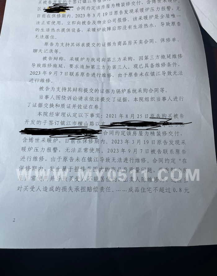 案由很简单,过程很波折。三年多前突然看中了南徐某著名精装修楼盘的一套大平层,开发商是镇江heng润房地产开发公司(应该是中南和南京某公司几家合股开发,其实说了开发商全名也没啥,且留点面子)。8月底签合同、10月底交付,把几个阳台稍稍改造了一下、定制家具、购买家电,春节就住进去了。实事求是说,精装修的标准品质还不错,所以其他都没动,住着也还挺舒服。。