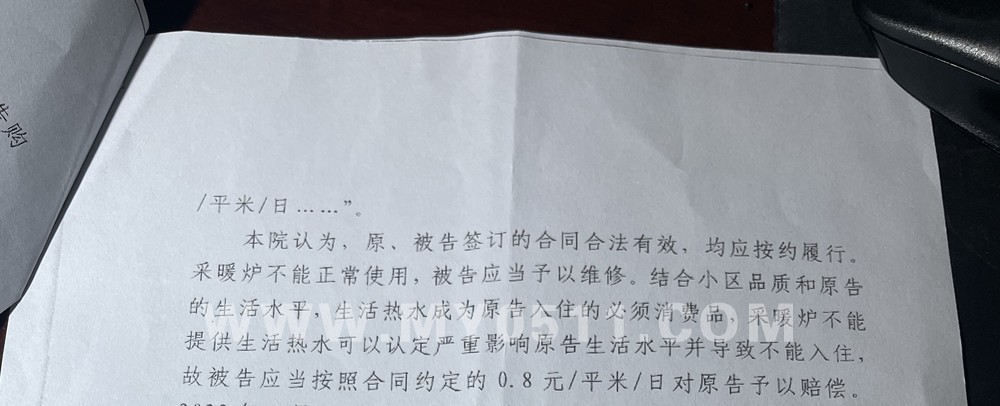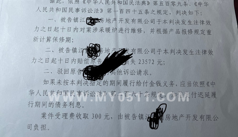 很快一两个月后便接到了一审判决,判1,开发商对采暖炉进行维修并重新计算保质期(此项因已更换采暖炉而视为履行)。2,赔偿本人损失2万3千多元。