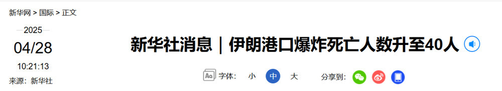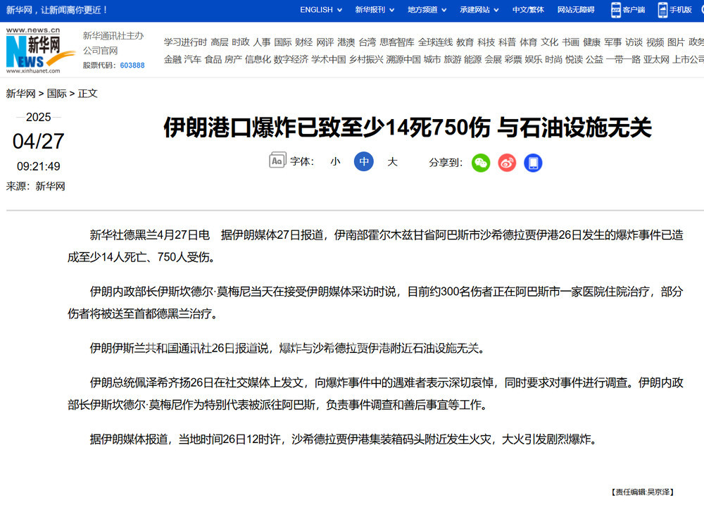 伊朗官方媒体援引伊朗内政部消息称,伊朗西南部 阿巴斯 港发生严重爆炸,已造成至少 14 人死亡,750 人受伤。新华社已更新数据。