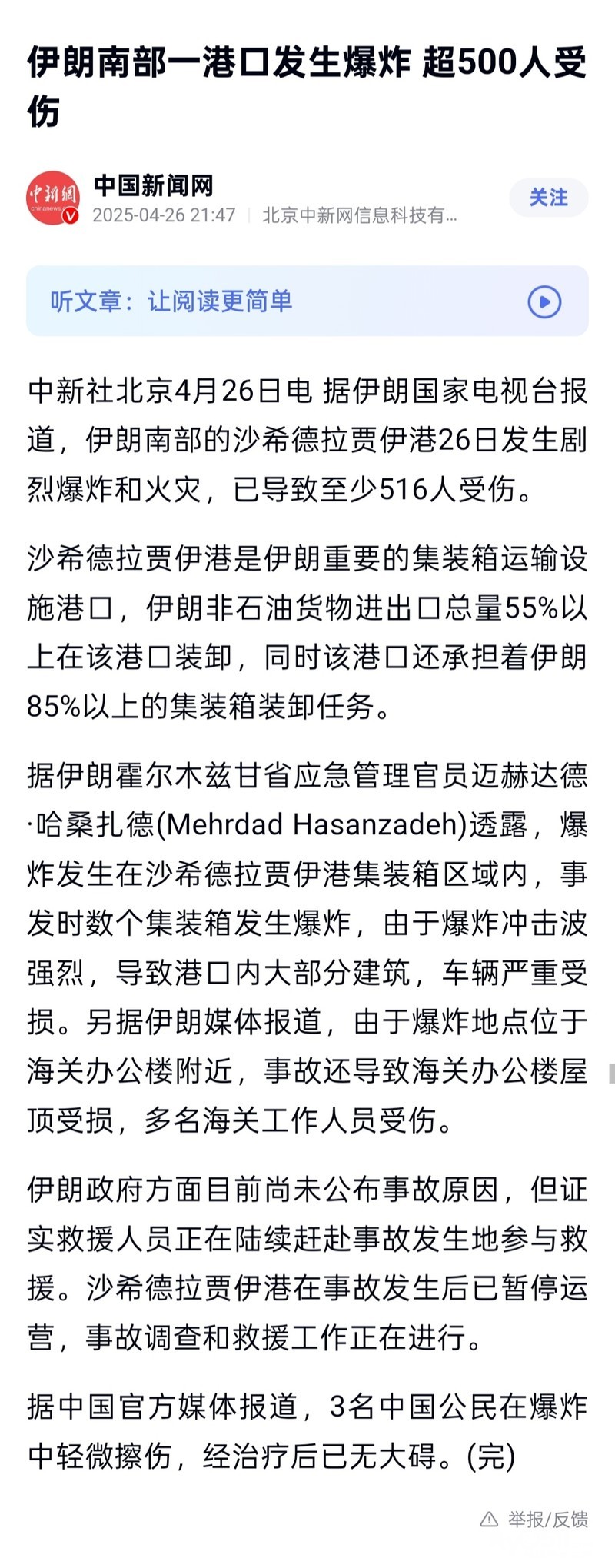伊朗阿巴斯港口发生爆炸70人死1200多人受伤 主要原因是安全疏忽