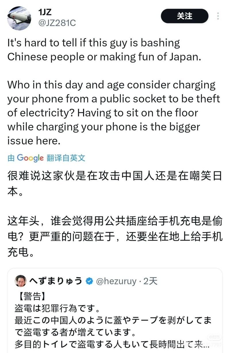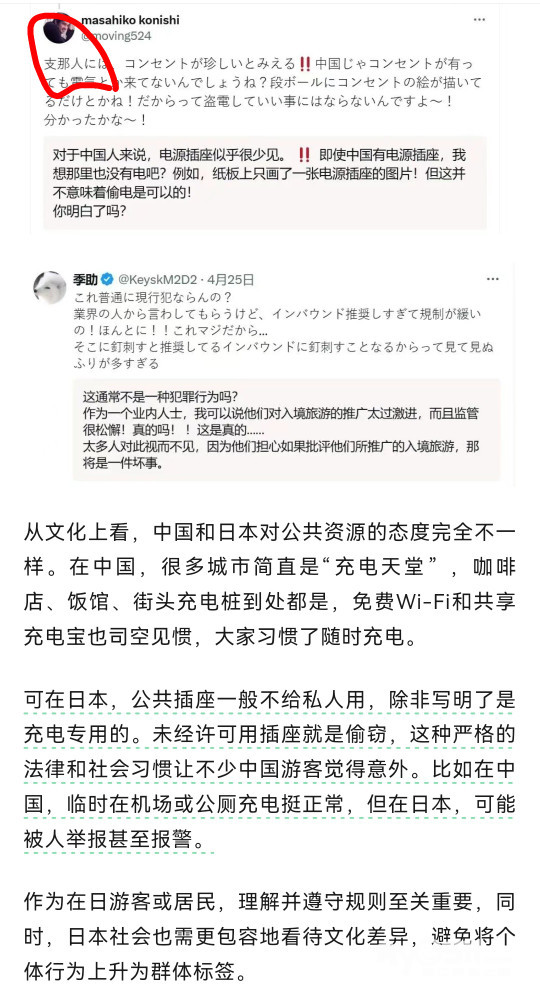日本人指责中国人充电的推特在X爆了。