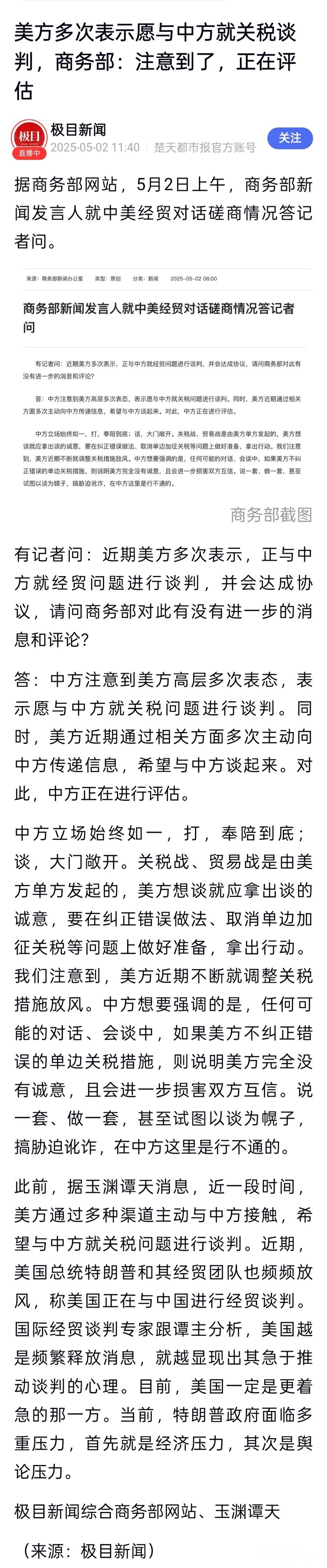 » 美方多次表示愿与中方就关税谈判,商务部:注意到了,正在评估
