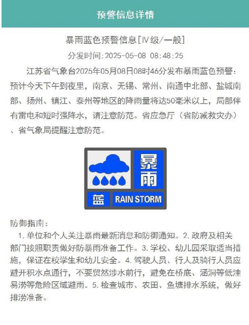 预计今天下午到夜里,南京、无锡、常州、南通中北部、盐城南部、扬州、