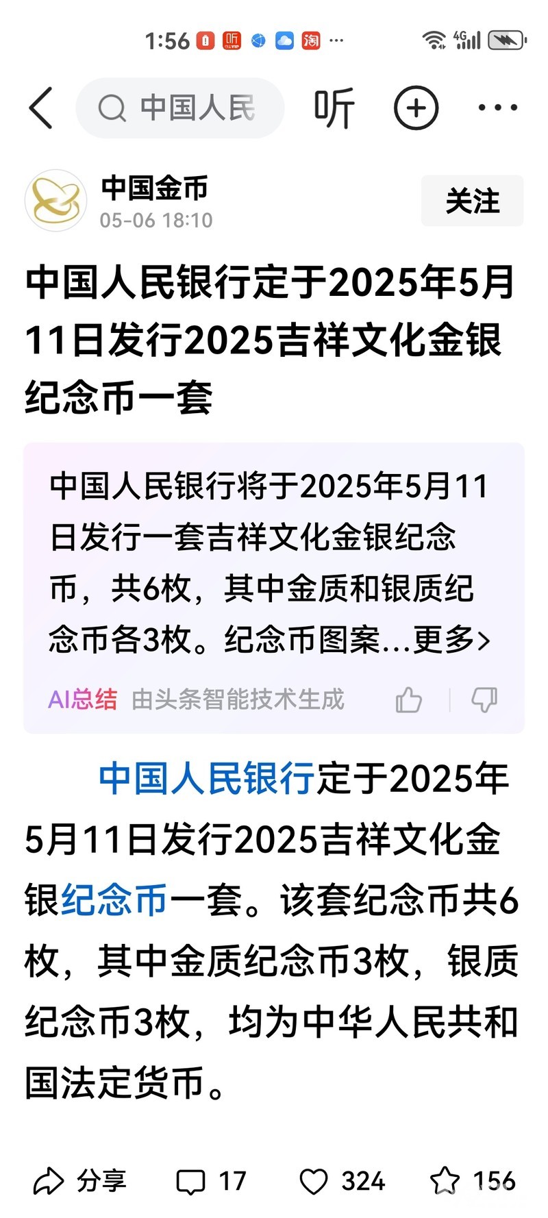 中国人民银行定于2025年5月11日发行2025吉祥文化金银纪念币一套