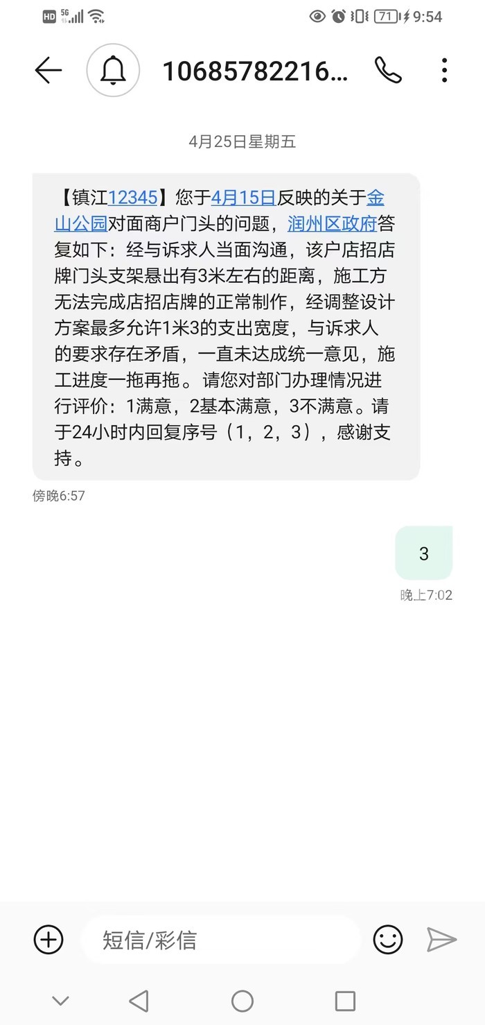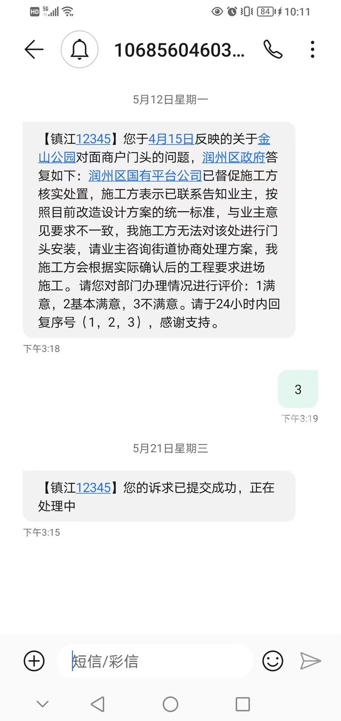 今天我是直接不想等了,直接投诉向12345投诉润州区人名政府,结果让我想不到的事,12345电话人员回复我说他们没权限投诉润州区人民政府。说我的事只能等润州区人名政府回复,我是彻底疲了。。。。。。