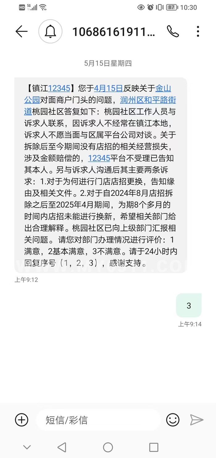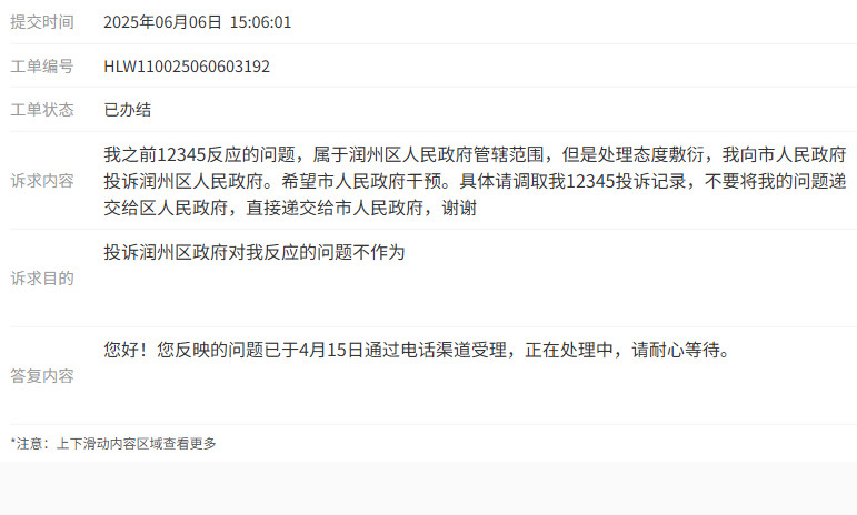最后15号社区联系了我给了我回复,并说把我这个诉求进行向上反应,至今没有回复,而且他把这个向上反映作为一个结果进行了关闭工单。后来我又打了12345我说这个不能结果来关闭工单,而且要有结果才行,然后至今我又打了312345。工作人员都是说工单派给了润州区人名政府,半个月了也没动静。