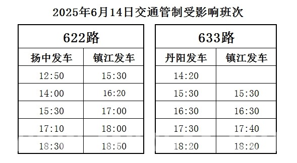 许嵩巡回演唱会(镇江站)将于6月14日在镇江体育会展中心体育场举行,期间冠城路和枣林路将于15:00-23:30实行交通管制。受此影响,我公司运营的公交622路和633路部分班次将临时取消停靠九华山路和体育会展中心公交站两对站点(具体受影响班次见下表),镇江始发站和终点站临时改为行政中心东站。敬请各位市民朋友知悉,调整至其他停靠站点候车。不便之处,敬请谅解!
