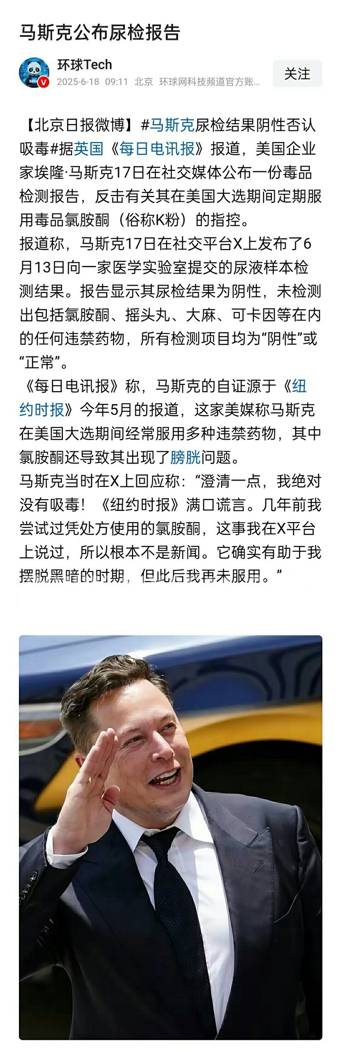 马斯克尿检暂且正常