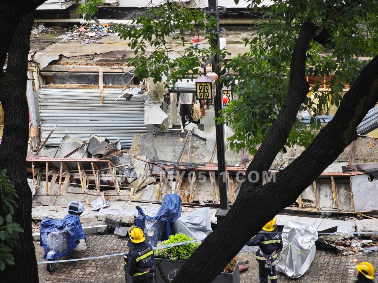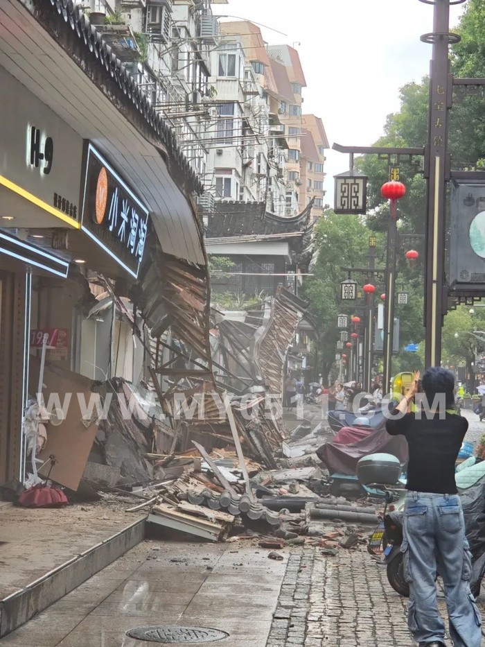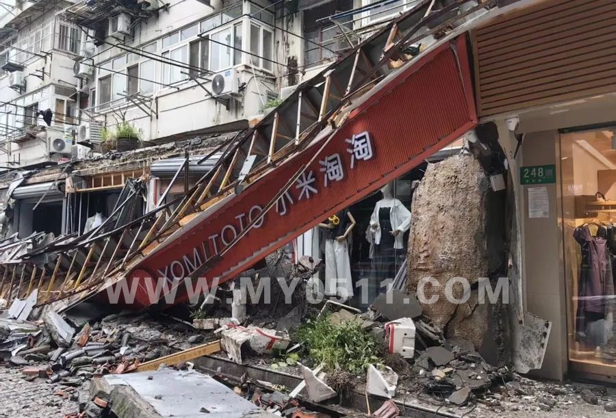 “只听现场传出‘轰隆’一声巨响,好几块店招店牌倒落下来,重重地砸在地面上。”有目击者称,事发时间为今天中午,事发地位于青年路靠近七宝老街牌楼附近。“幸亏当时正在下雨,门店周围行人和游客并不太多。”还有途经市民回忆,意外发生之后,消防队员及时赶到,万幸的是,现场没有人员伤亡。市民拍摄的现场照片显示,一家名为“小米淘淘”的长条橙色店招严重垮塌,连带部分墙体一并脱落,砸在人行道上。现场散落着玻璃碎片、墙体碎块和部分彩钢板结构。