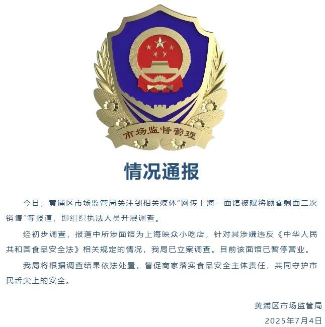 7月4日,上海市黄浦区市场监管局发布《情况通报》。黄浦区市场监管局关注到相关媒体“网传上海一面馆被曝将顾客剩面二次销售”等报道,即组织执法人员开展调查。