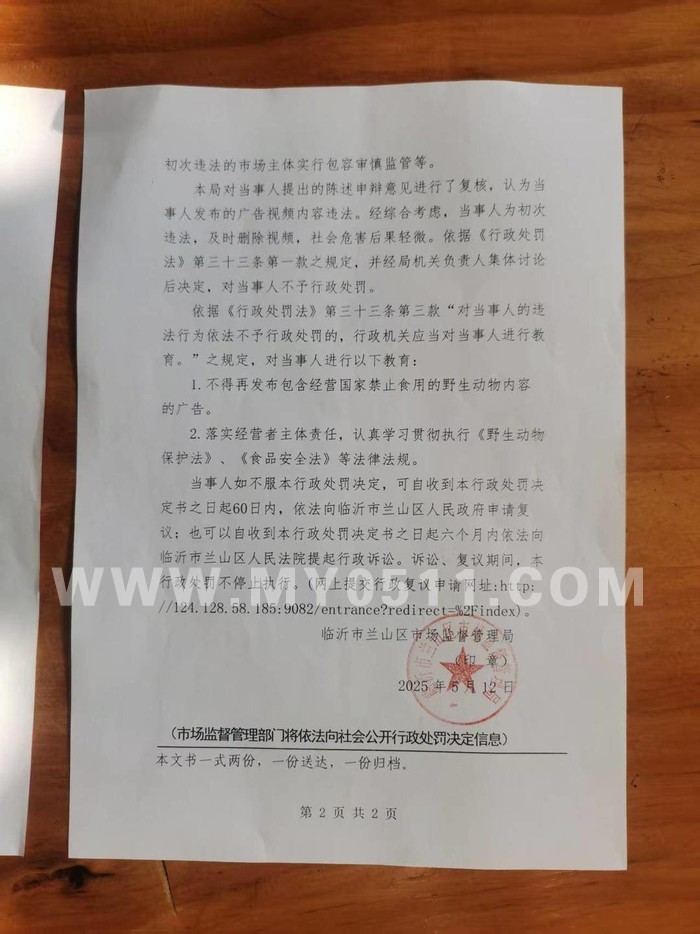 7月14日早晨7点,兰山区市场监管局工作人员抵达涉事饭店,向当事人送达了《不予行政处罚决定书》(临兰市监不罚决字〔2025〕1号),该决定书中称“经调查,当事人在其抖音账号发布了5条宣称含有国家禁止食用的动物蛤蟆菜品内容的广告视频。经营者发布宣称以蛤蟆为食品原料的食品的广告的行为”,违反了相关法律规定。