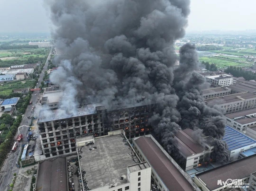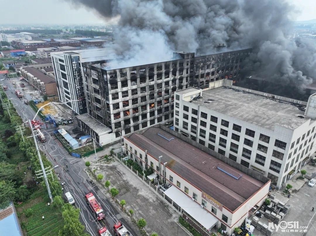 下午3时许,记者到达位于丹阳市界牌镇事故企业现场时,仍有明火可见,一栋七层厂房燃烧后只剩下框架。