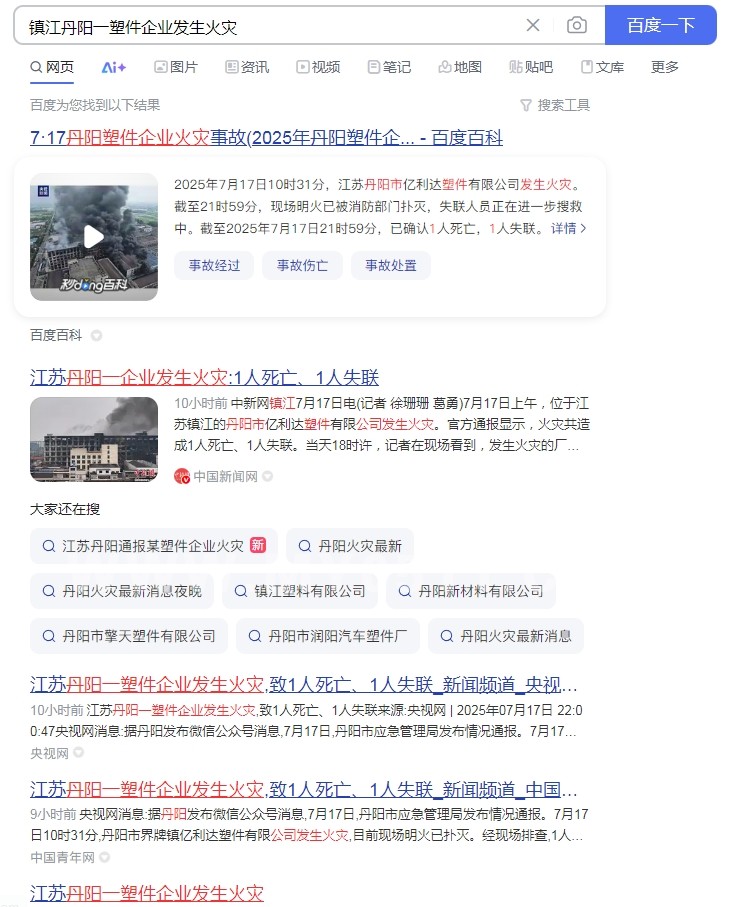 人民网镇江7月17日电(马 梁明)17日上午,江苏镇江丹阳市亿利达塑件有限公司发生火灾。