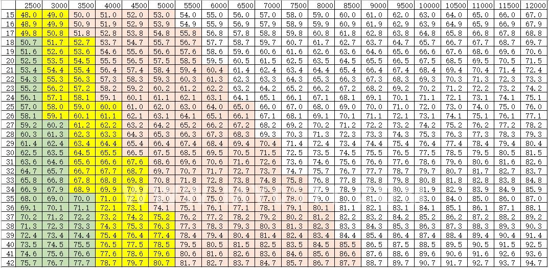 最左边是工龄,最上边是去年12月退休金,未考虑70周岁以上倾斜部分。其中绿色部分养老金增幅达到2%以上,黄色部分增幅达到1.5%以上,粉红部分增幅达到1%以上,其余增幅均在1%以下。