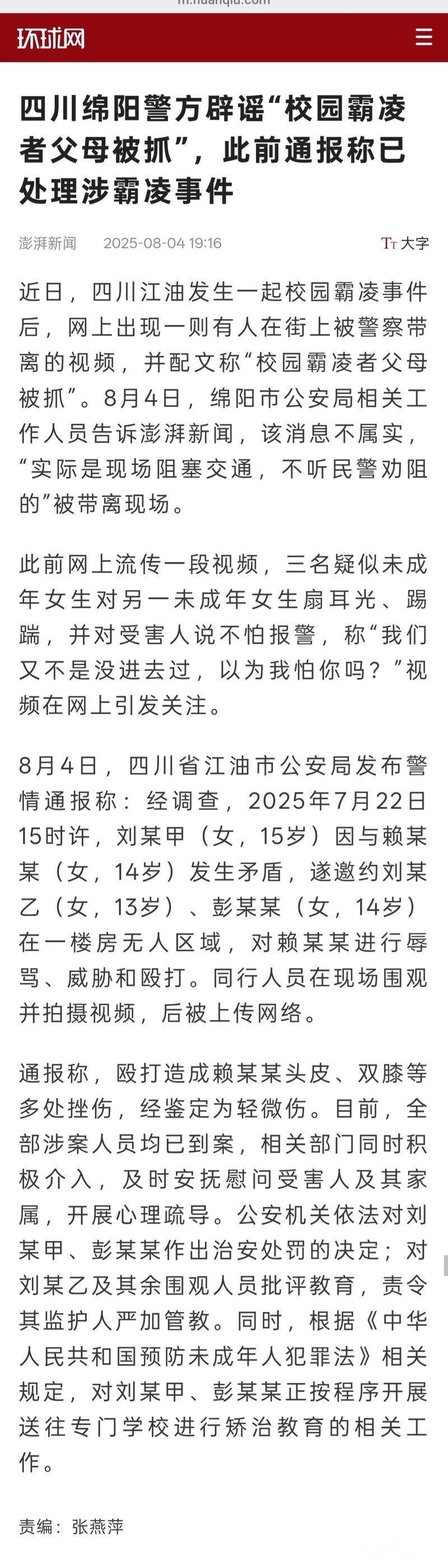 » 四川江油警方辟谣“校园霸凌者父母被抓”,此前通报称已处理涉霸凌事件