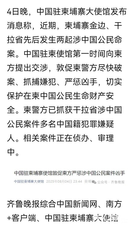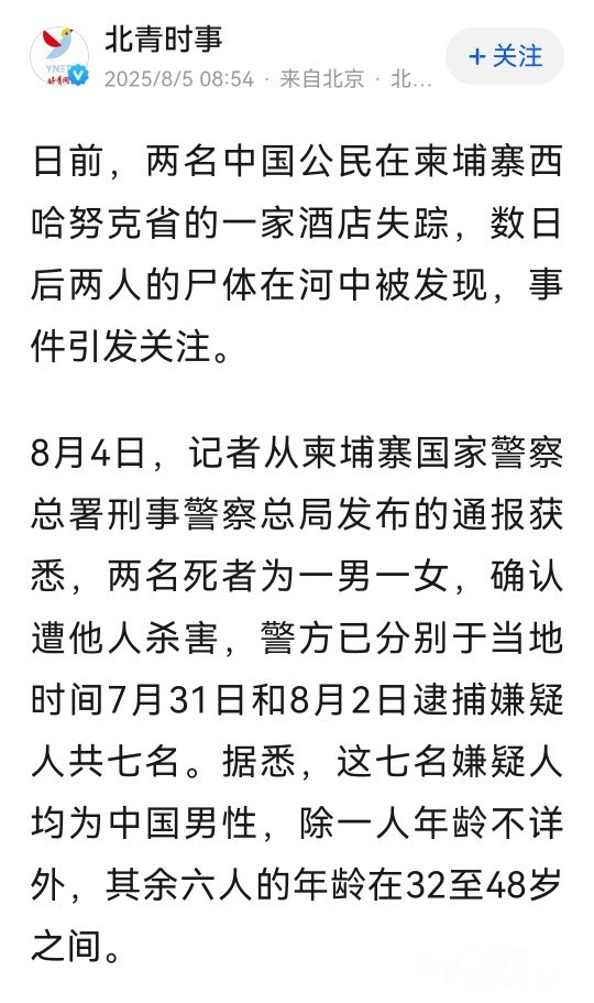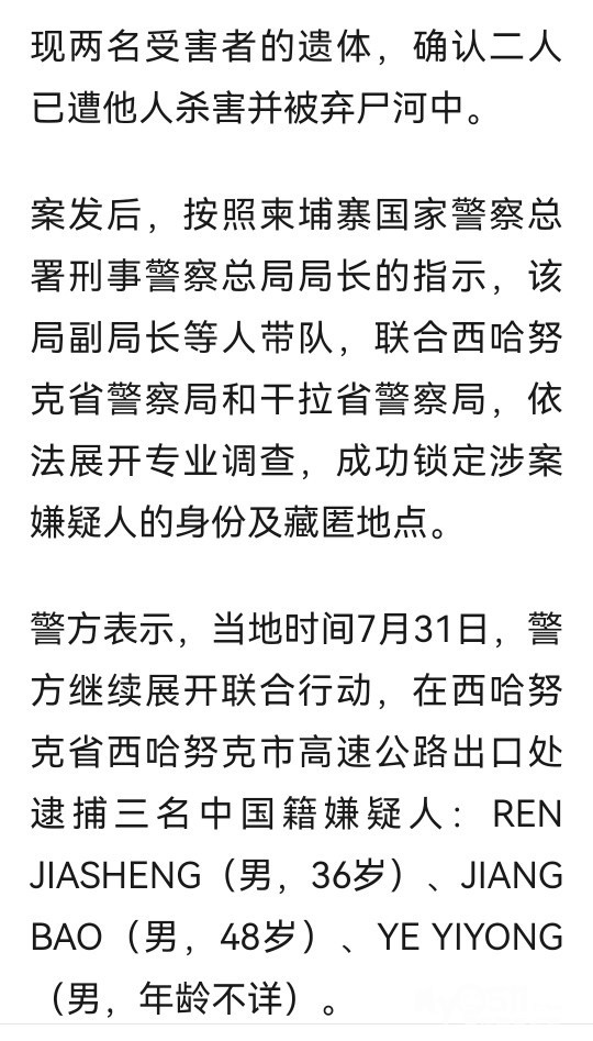 » 两名中国公民在柬埔寨遭杀害抛尸,警方逮捕7名嫌疑人,均为中国男性,中使馆:严惩!