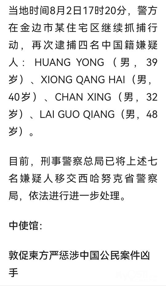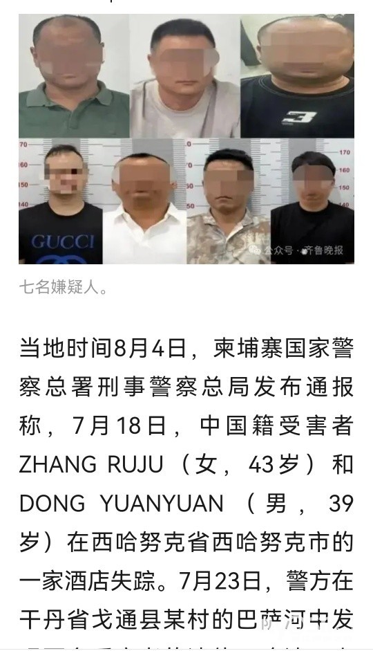 两名中国公民在柬埔寨遭杀害抛尸,警方逮捕7名嫌疑人,均为中国男性,中使馆:严惩!